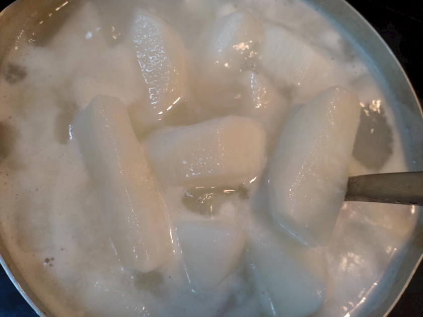 (面取りしてお米のとぎじるてでぐつぐつ)