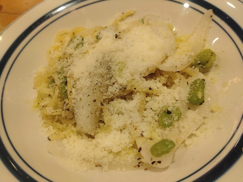 フランス産そら豆と新玉ねぎのカーチョエペペ風スパゲッティ