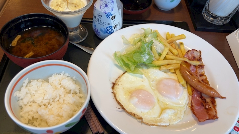 メニューは目玉焼き、ポテト、ソーセージ、ベーコン、ご飯、味噌汁、なんとデザートにバナナヨーグルまでセットでしたΣ( ˙꒳˙ )バナナヨーグルは単品で追加注文可能ですがセットに含まれているのは嬉しいです(*´˘`*)