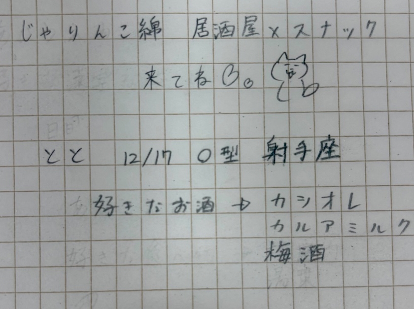 字は人柄が出るって言うけど、迷信だって信じたい。 - とと - 居酒屋×Snack じゃりんこ錦・ジャリンコ ニシキ - 名古屋 錦のスナック