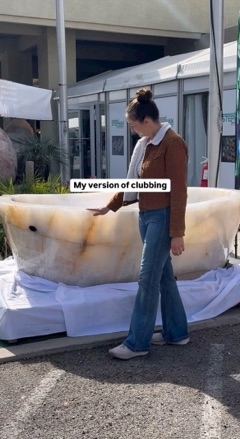 何かを覗き込み驚く女性
