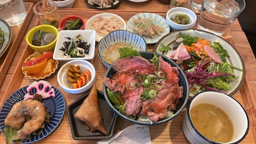 小鉢が12種類✨スープと黒もち米のローストビーフ丼