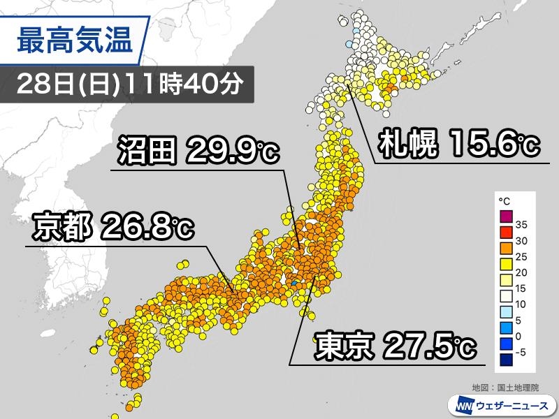 11時40分までの最高気温は群馬県沼田市で29.9℃、福島県伊達市・梁川で29.8℃など内陸部では30℃に迫っている所があります。そのほか、東京都心で27.5℃、京都市では26.8℃とすでに夏日です。
