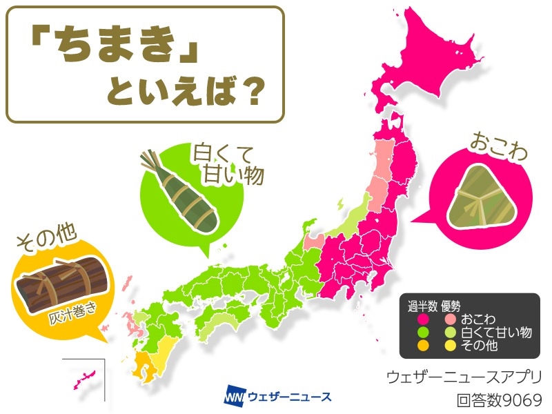 さらに、ちまきは地域によって材料や作り方が異なるようです。ウェザーニュース で「ちまきといえば?」というアンケート調査を実施したところ、地域によって明瞭な差が現れました。