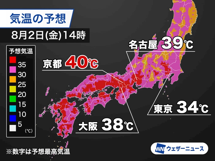 予想最高気温は、京都市で40℃とこれまでで一番の暑さを更新する可能性があります。名古屋市や岐阜市、大分県日田市で39℃、大阪市などでも38℃と、西日本や東海を中心に体温を大幅に上回る危険な暑さとなる見込みです。東京都心でも34℃予想と連日の厳しい暑さが続くとみられます。