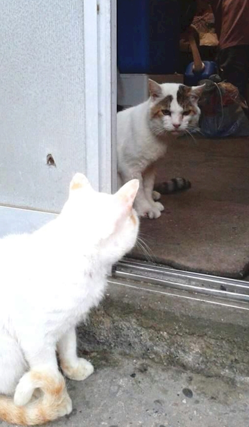 ネコとネコが、引戸のあっちとこっちで