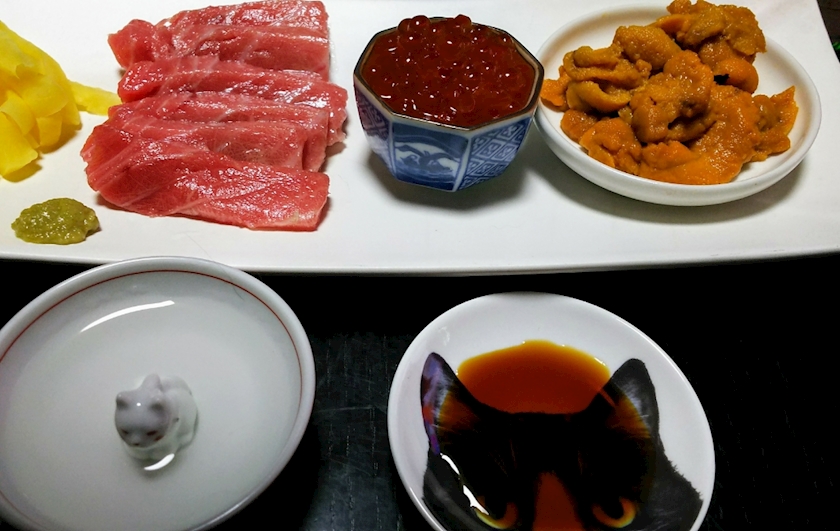 長皿に中トロ、イクラ、ウニを並べて
