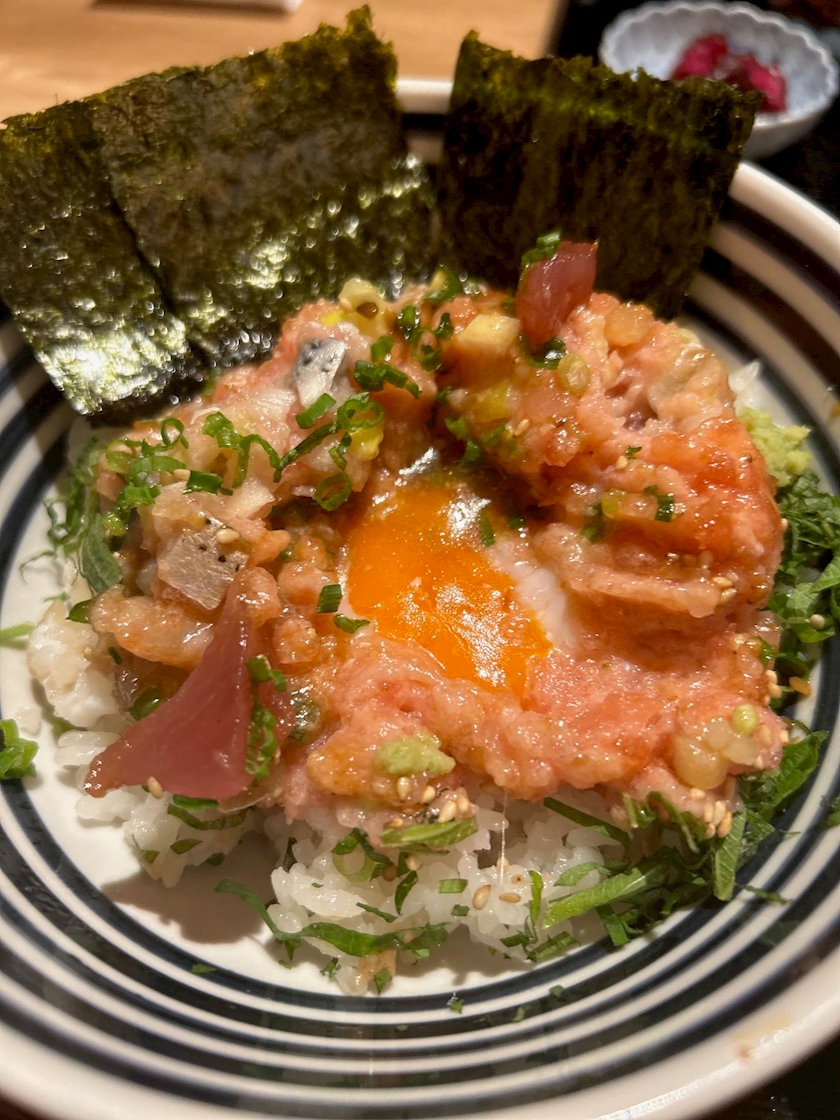 ネギトロに色んな魚が小さく買ったの入っててなめろうみたいな感じなんだけど、たまにコリコリ食感もあるの笑