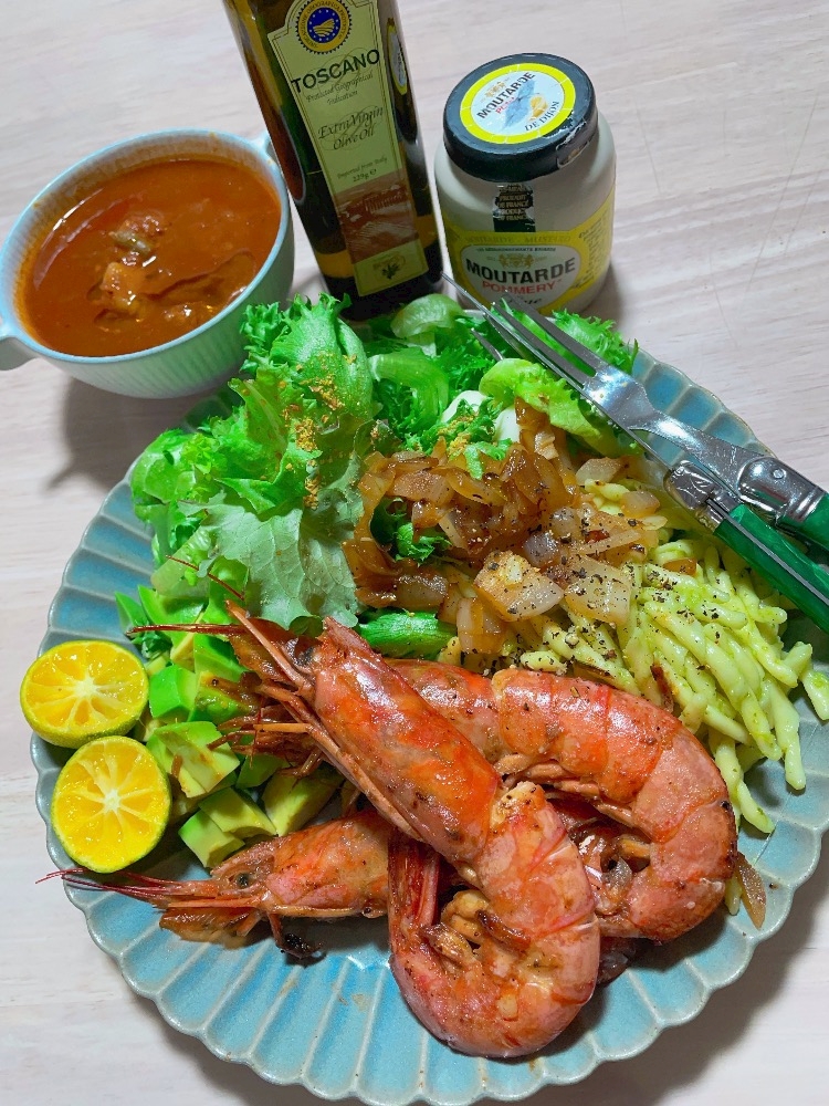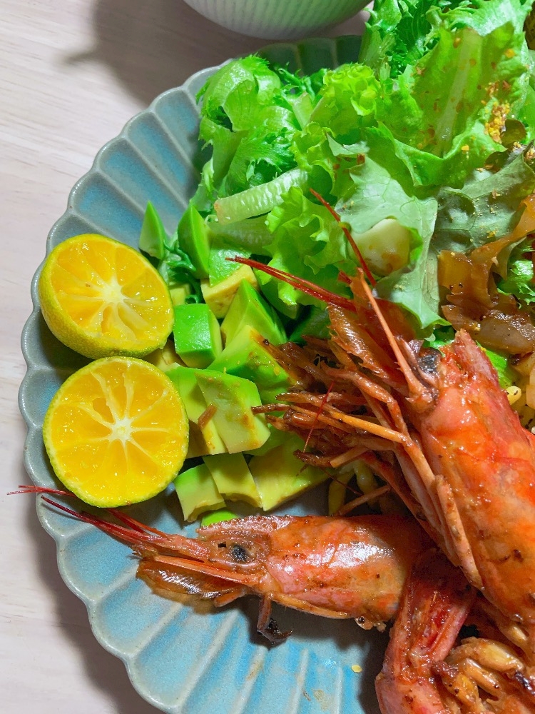 - 今日のきゃなぴーのおうちごはん🍽🦐🦐🦐🍝🥗🥑🧀