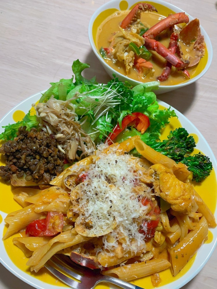 ブイヤベースでパスタと🍝お野菜たっぷりごはん🥦🥬🍅🥕