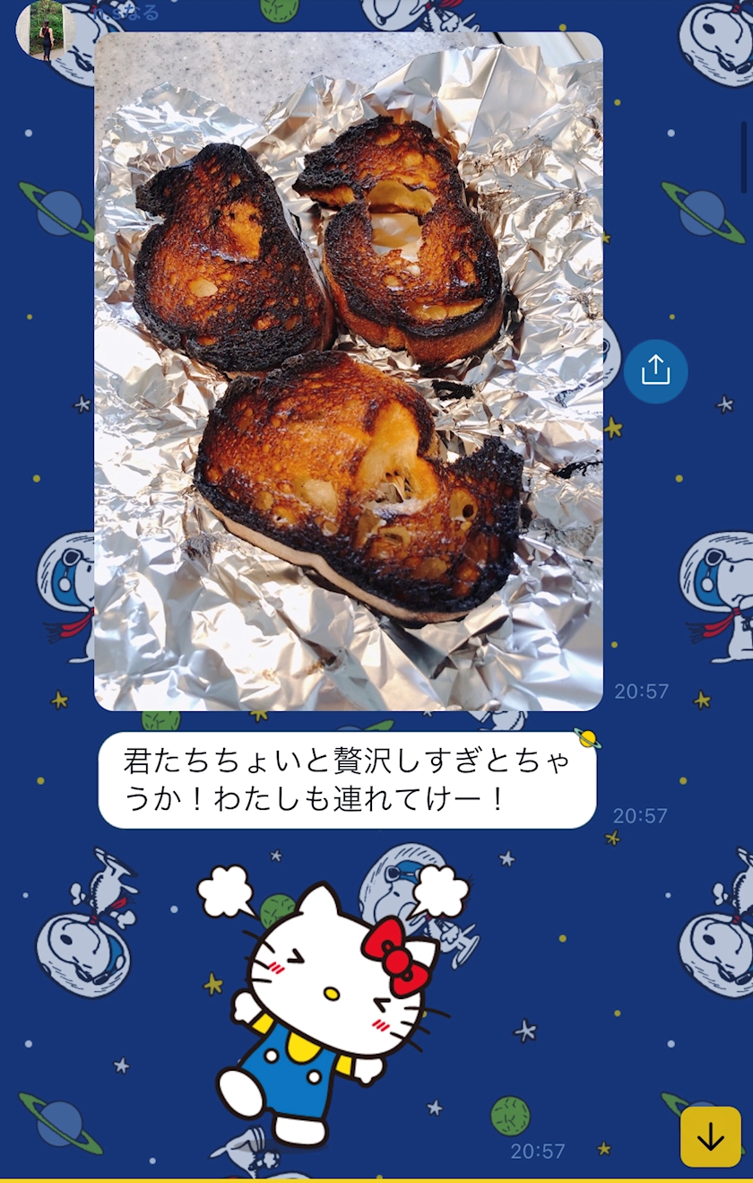 それでもなんか対抗できるもの送りたくて、考えて考えて考え抜いた結果とち狂って焦げたパンの写真送ってきた😂😂😂(笑)