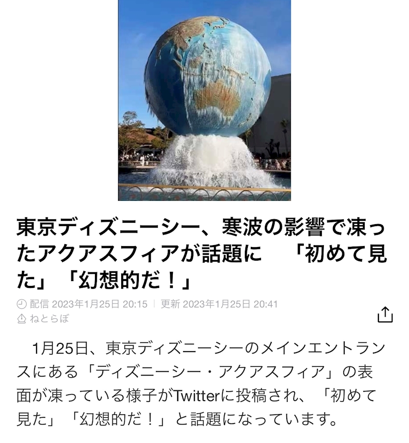 そりゃディズニーシーの地球儀も凍るわ!