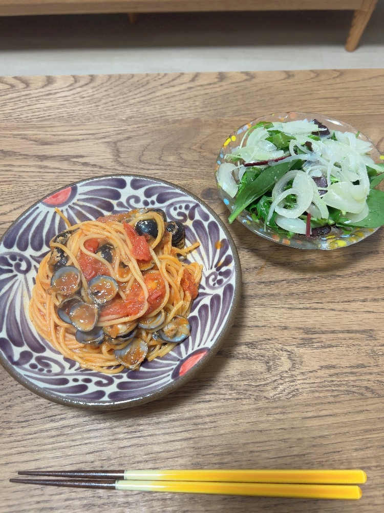 シジミのボンゴレ風パスタとサラダを仕事終わってから作って🥗