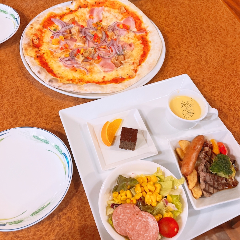 大きめにピザとパスタ、そんで1人ずつのサラダとかそういうの