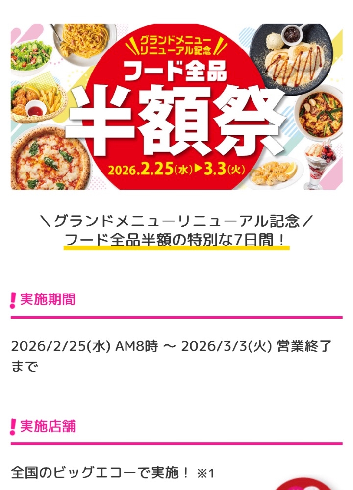 2.26ビッグエコーのフード全品【半額祭】知ってますかー!?