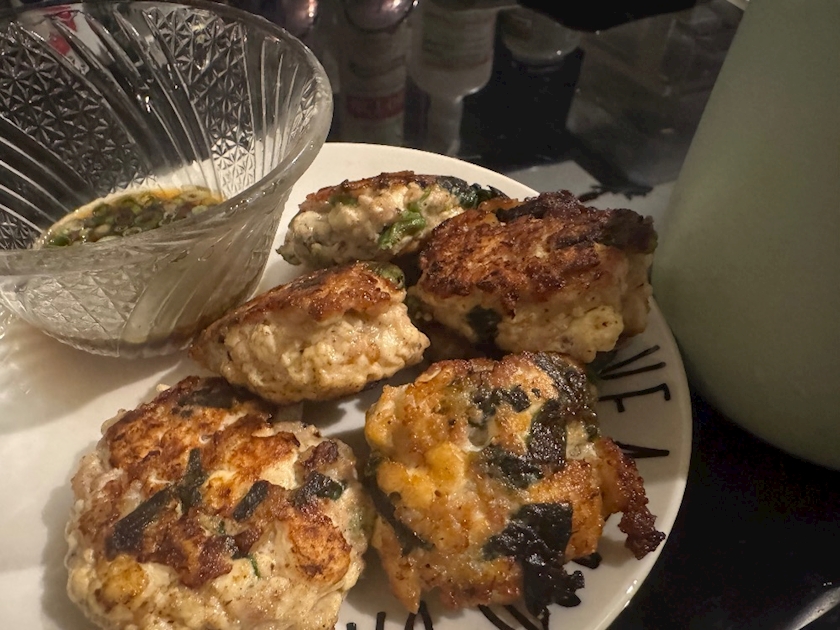 木綿豆腐と鶏ミンチ、えび、ほうれん草を混ぜ混ぜして焼いてみたー!