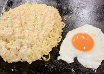 麺を入れて目玉焼きをのせる準備