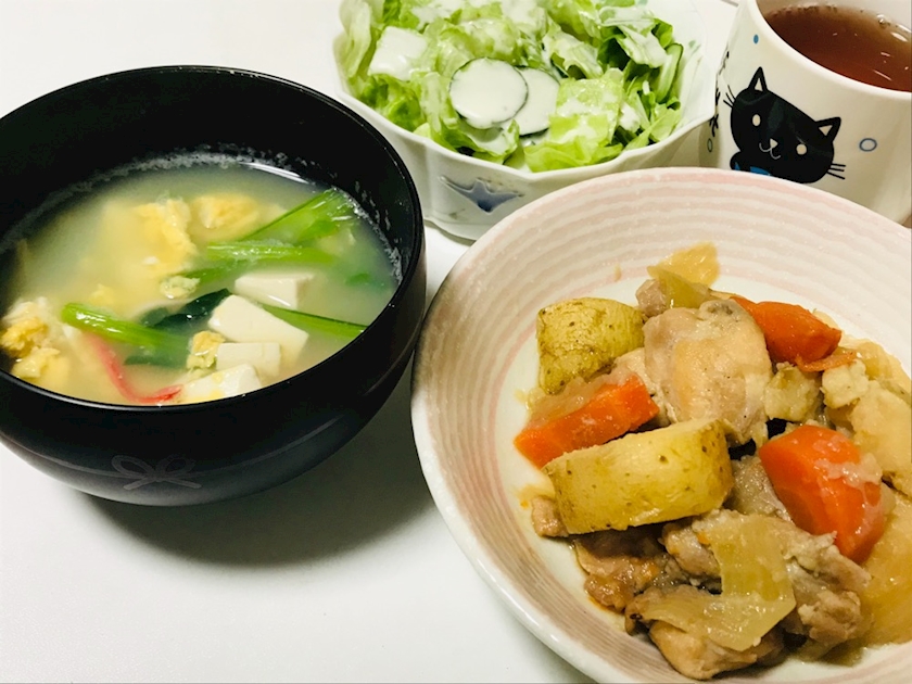 シーザーサラダ、中華スープ、鶏肉の肉じゃが