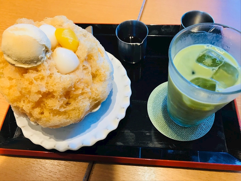 アイス、白玉、栗トッピングして、抹茶オレも頼んでた😂