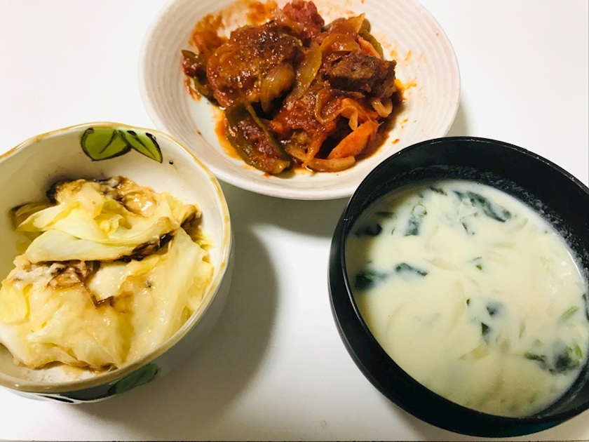 ミルクスープ、ハンバーグのトマト煮、キャベツのチーズステーキ