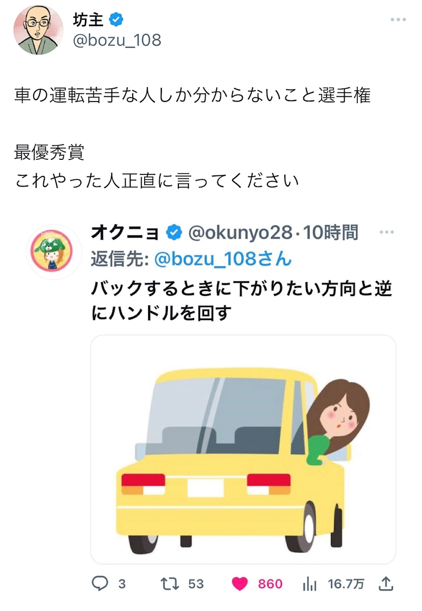 ⬆️教習所にいた時から、バッグするときのハンドル操作が分からんくなって頭バグってた(^q^)