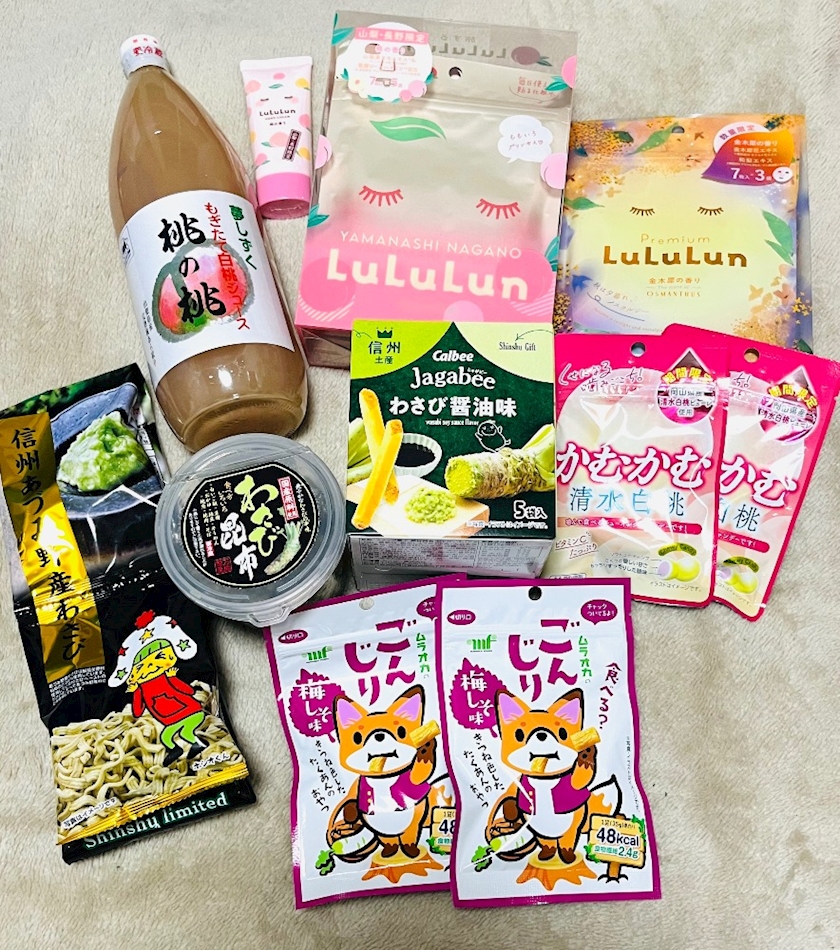 桃ジュース、ルルルンのパック2種類&ハンドクリーム、わさび昆布、わさび味のお菓子2種、かむかむの桃とごんじり梅しそ味✨