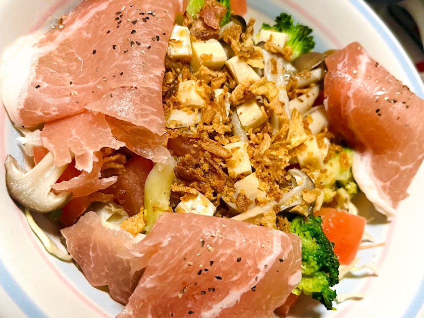 キャベツ、トマト、ブロッコリー、炒めたきのこ、生ハム、チーズ、フライドオニオン✨