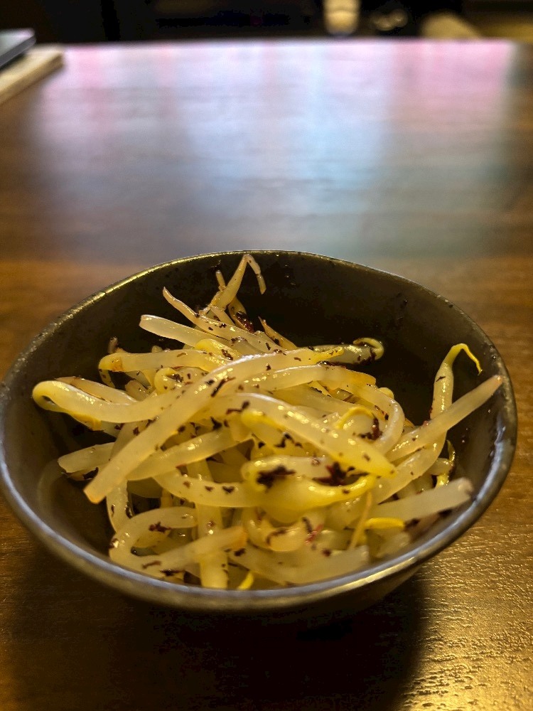ゆがいたもやしにごま油とゆかりを