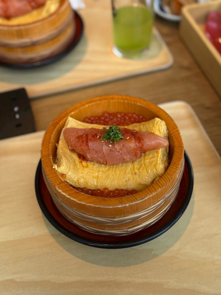 ご飯の上に、いくら、明太子、卵焼き