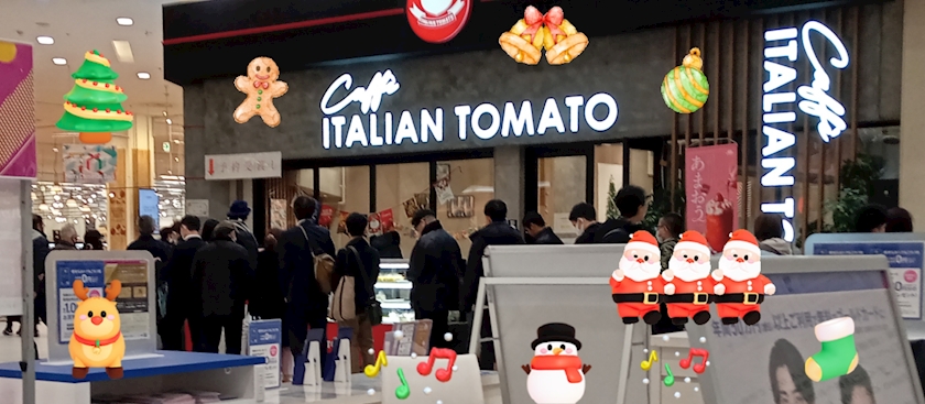 ケーキ屋さんの前で黒いサンタさんが