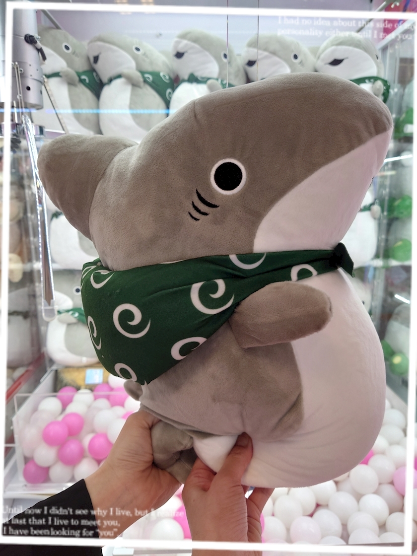 友がまたサメの(ぬいぐるみ)前から