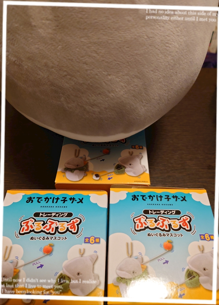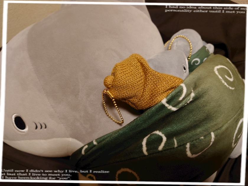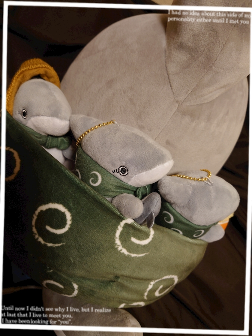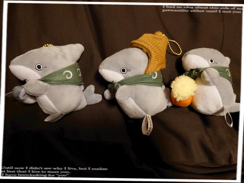 子ザメのぬいぐるみと共に