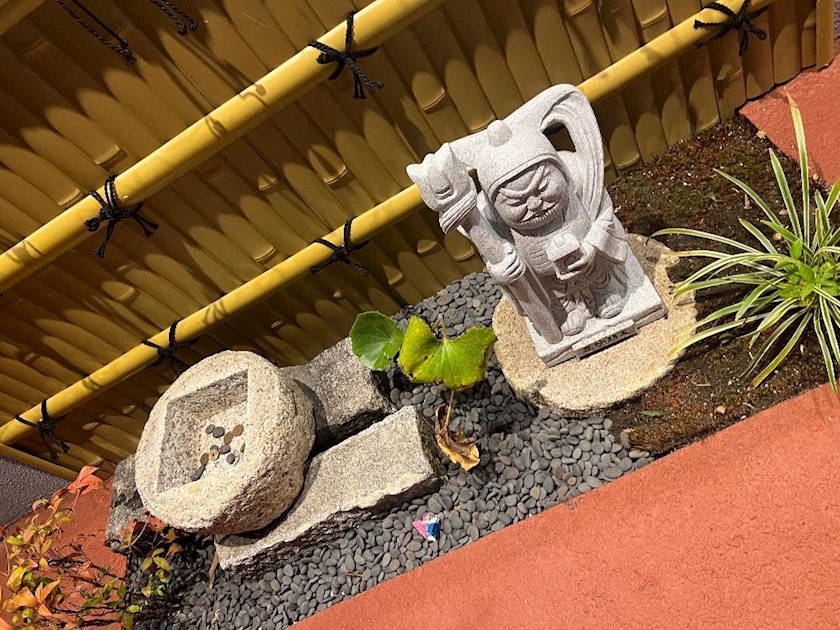 外に石の置き物あって