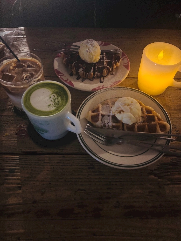 自分はワッフルにバニラアイスとキャラメルソースをトッピングあと抹茶ラテ‼️