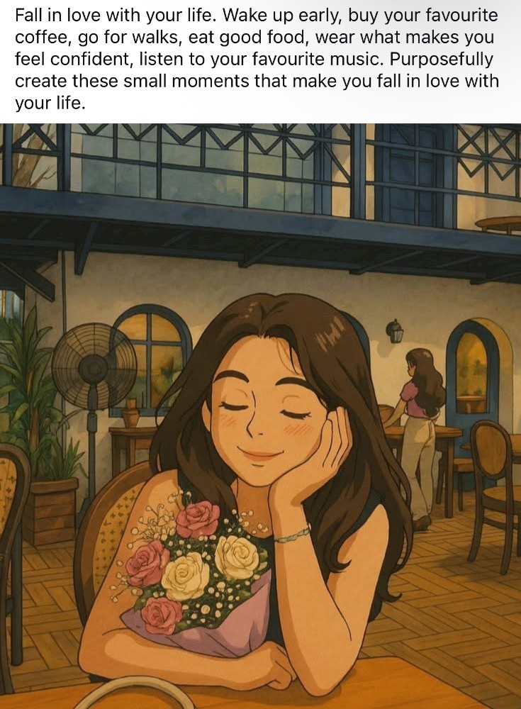 自分の人生を愛しましょう。早起きして、お気に入りのコーヒーを買って、散歩に出かけ、美味しいものを食べ、自信が持てる服を着て、好きな音楽を聴きましょう。人生を愛せるような、そんな小さな瞬間を意図的に作り出しましょう