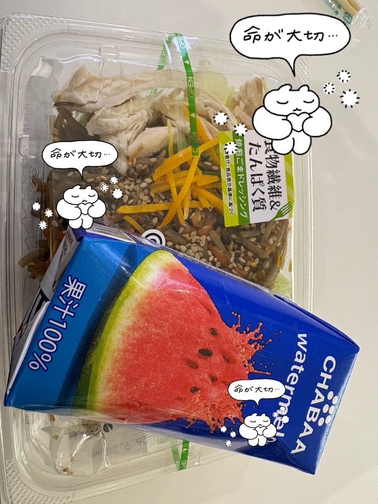 (今日は)(サラダも食べてみる)(ことにしました)(スイカジュースはデフォ)
