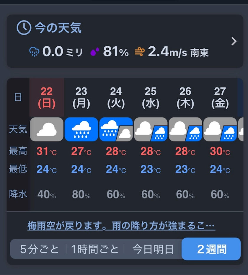 - 6/22(日):雷雨の可能性あり、最低25 °Cと蒸し暑さ増。