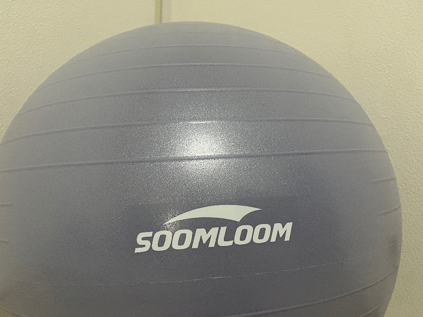 - 床に座り、バランスボールに足を乗せる(ふくらはぎをのせる)。