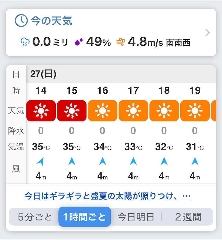 - 熱中症のリスクが非常に高いため、外出の際は日傘・帽子・水分補給を忘れずに。