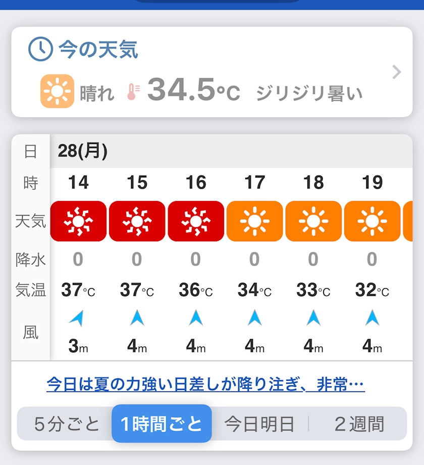 気温37度はもう「危険な暑さ」と言っていいレベルです。外をちょっと歩くだけでも体力を奪われるし、熱中症のリスクもかなり高まります。