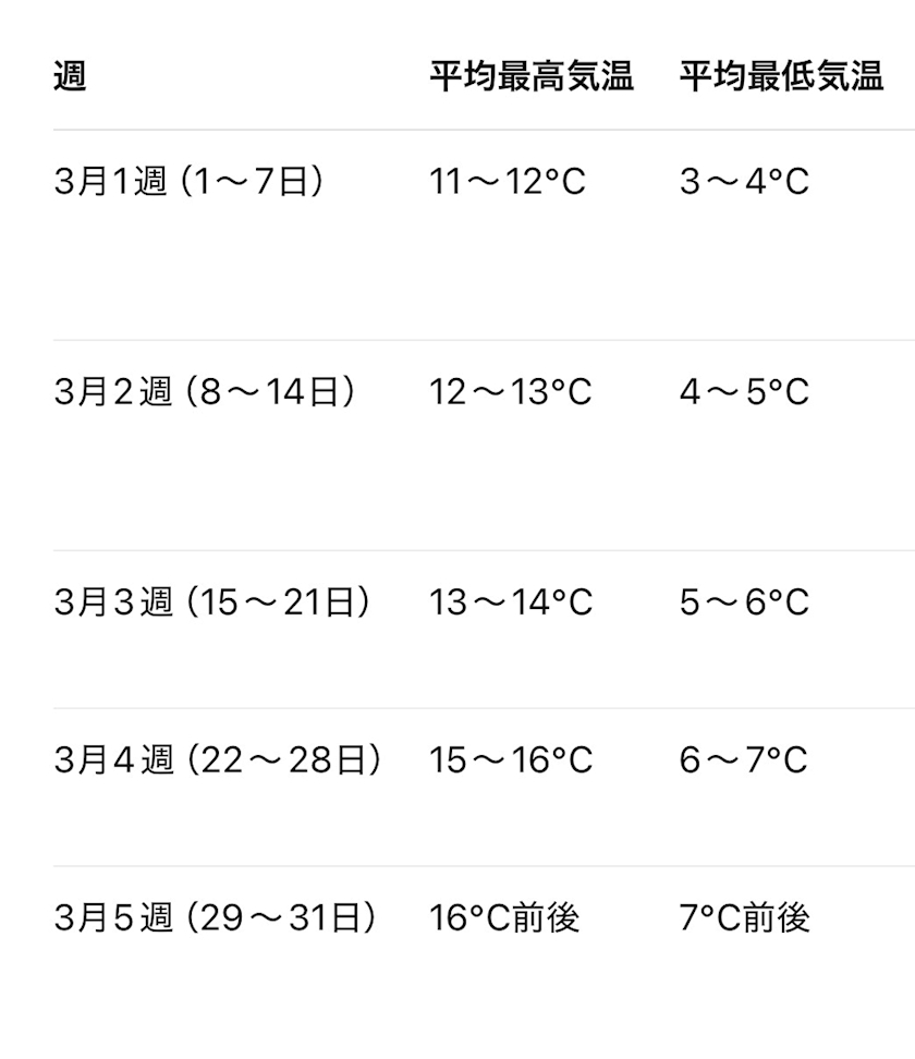 - 3月後半になると日中は15℃以上になることも多く、朝晩はまだ少し寒い感じです。