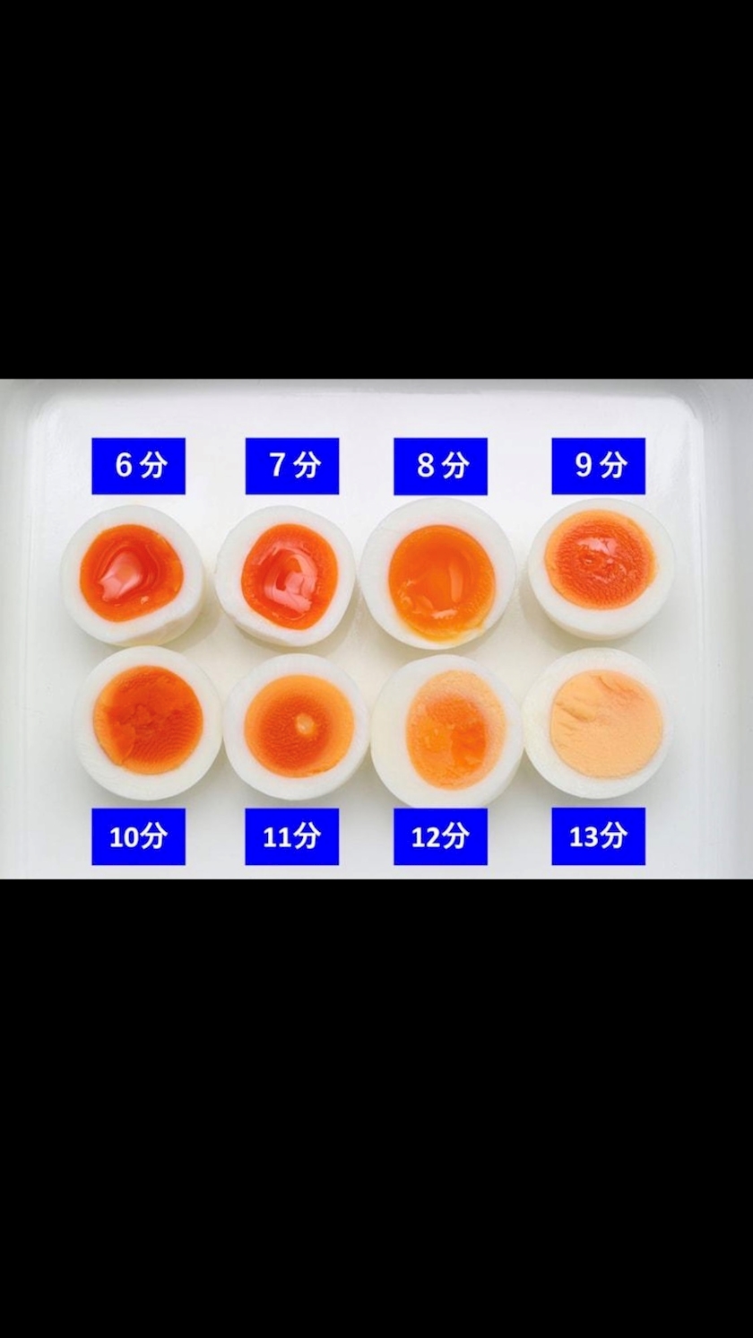 - 6分:とろとろの半熟(黄身がかなり柔らかい)