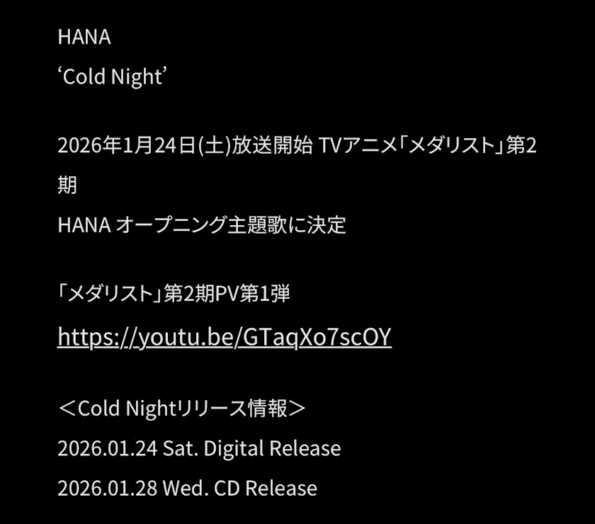 来年1月発売の新曲『Cold Night』