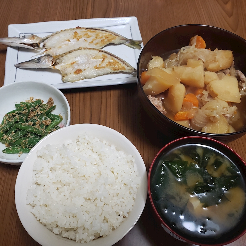 肉じゃがとかますといんげんの胡麻和えと