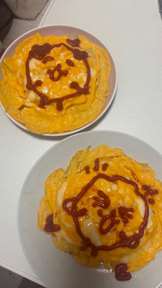 友達と一緒にオムライス作って、ケチャップでLINEの好きな絵文字描いたよー