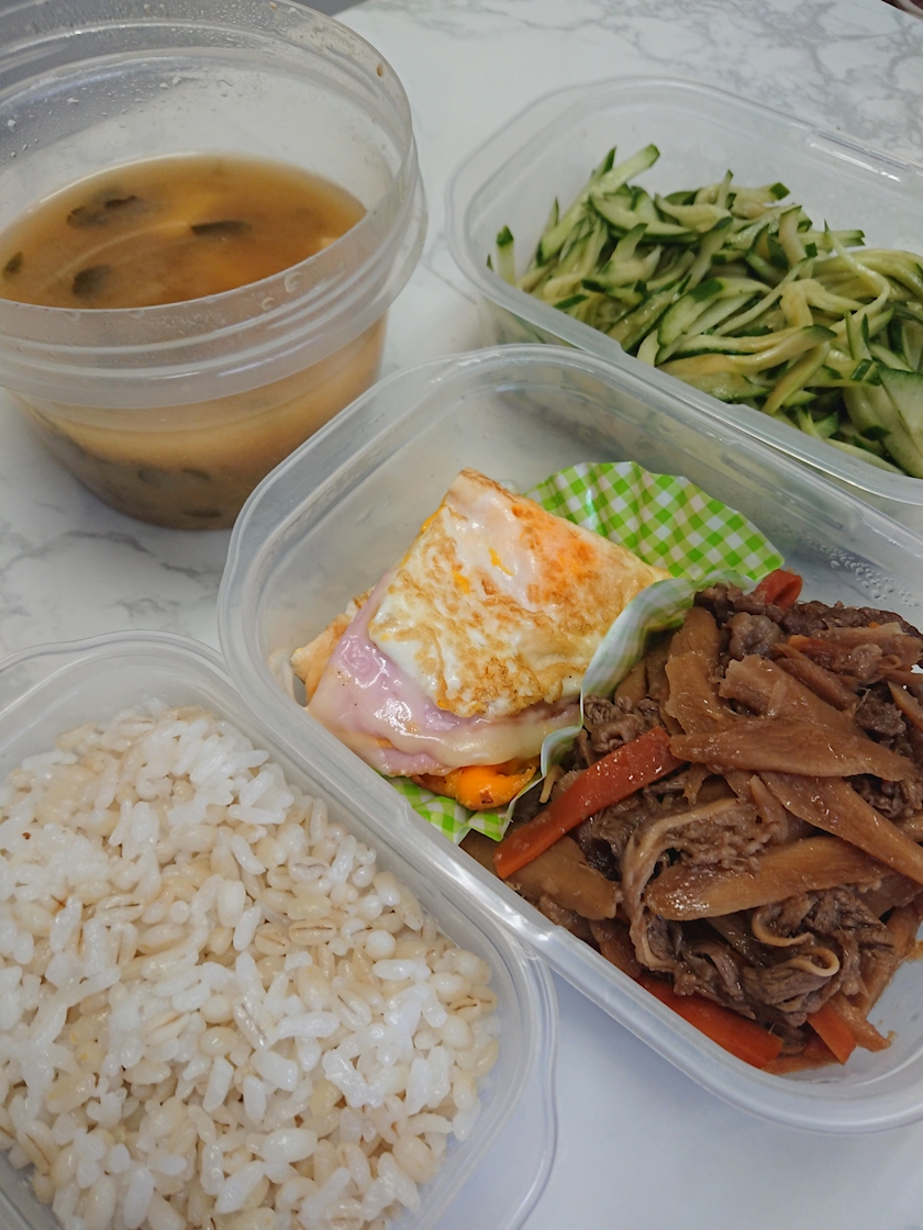 味噌汁、🥒、牛煮