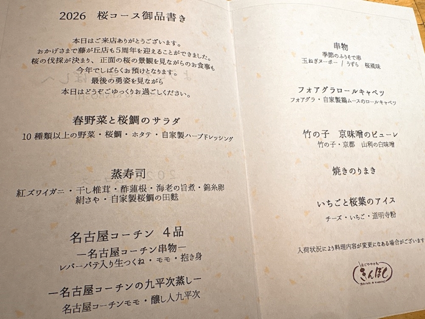 - 桜のこの時期毎年お邪魔している『きんぼし』さんの桜コース🌸今年も行けた~🥳伐採が決まったので桜を眺めながらのお食事は今年でしばらく見納めです🌲