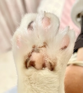 暴れすぎて後ろ足の肉球しか