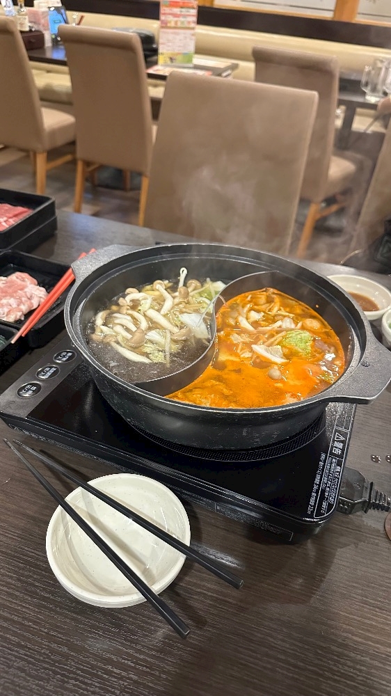 右の赤いのは辛い味噌チゲ?的なやつなんだけど