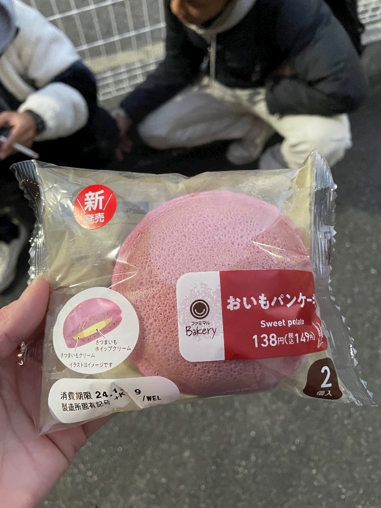 研修生がパンコーナーでピンク(紫)のパン見つけて